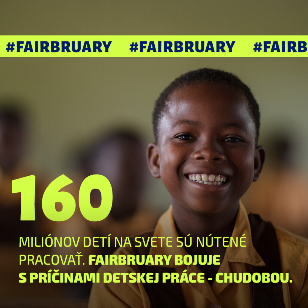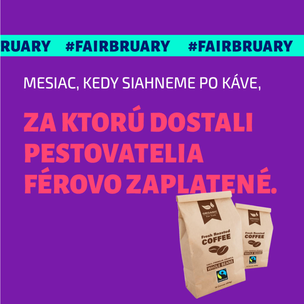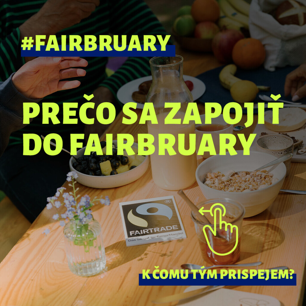 Mesiac, počas ktorého Vás chceme motivovať, aby ste sa zastavili, zamysleli a skúsili urobiť malý krok smerom k férovejšej a udržateľnejšej budúcnosti. Využite Fairbruary na objavovanie ďalších fairtradových produktov. Fairtradovú čokoládu alebo kávu asi poznáte. Skúste ochutnať aj fairtradové banány, darujte fairtradové rezané kvety alebo vyskúšajte textil z fairtradovej bavlny. So známkou FAIRTRADE možno nakúpiť aj mnoho ďalších produktov; cieľom je, aby ľudia, ktorí pre nás tieto produkty pestujú, dostali za svoju prácu spravodlivejšie zaplatené.