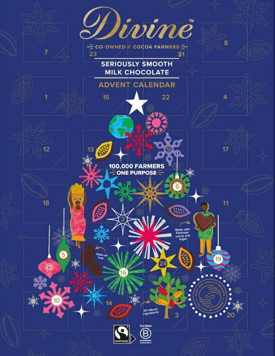 Milovníkov čokolády poteší adventný kalendár spoločnosti Divine s čokoládovými srdiečkami z jemnej 70 % horkej čokolády. Čokolády Divine sú vyrobené z fairtradových kakaových bôbov, ktoré dodáva družstvo drobných pestovateľov Kuapa Kokoo v africkej Ghane. Tamojší farmári pestujú kakao v tieni dažďového pralesa, pomaly ho fermentujú a sušia na slnku.